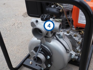 - Заливная горловина. Перед первым пуском достаточно залить воду в корпус мотопомпы, воздух во всасывающем шланге она прокачает сама.