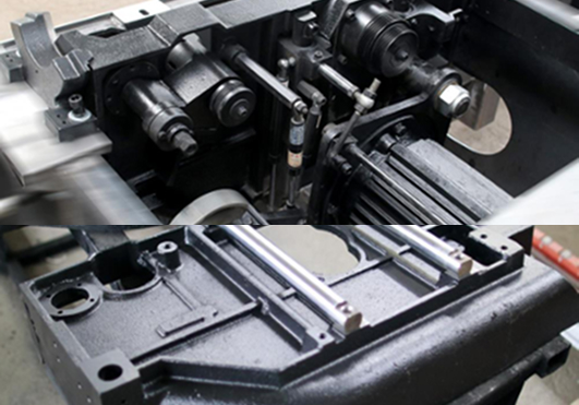 Литой корпус пильного узла обеспечивает высокую жесткость, виброустойчивость и надежность станка. Современная конструкция и обязательная 12-часовая обкатка на заводе-изготовителе при приемке станка гарантируют идеальное пиление в любых условиях производства. В станке реализована система быстрой смены частоты вращения основной пилы. Пильный узел установлен на цельной литой чугунной плите, прошедшей термическую обработку, с усиленными ребрами жесткости, что исключает вибрацию всей системы даже при сверхвысоких нагрузках. Вся чугунная плита обрабатывается на большом металлообрабатывающем центре с ЧПУ за один проход, что обеспечивает идеальную точность привалочных плоскостей.