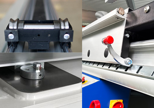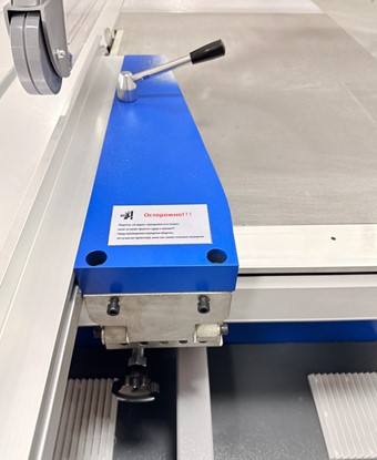 Опорный стол можно передвигать и быстро фиксировать с помощью мощного зажима. Система настройки и регулировки диагоналей, выполненная с 2-х сторон стола, позволяет применять схему раскроя на мелкие детали «от себя», так, как это выполнено на станках ведущих европейских производителей.