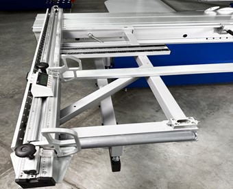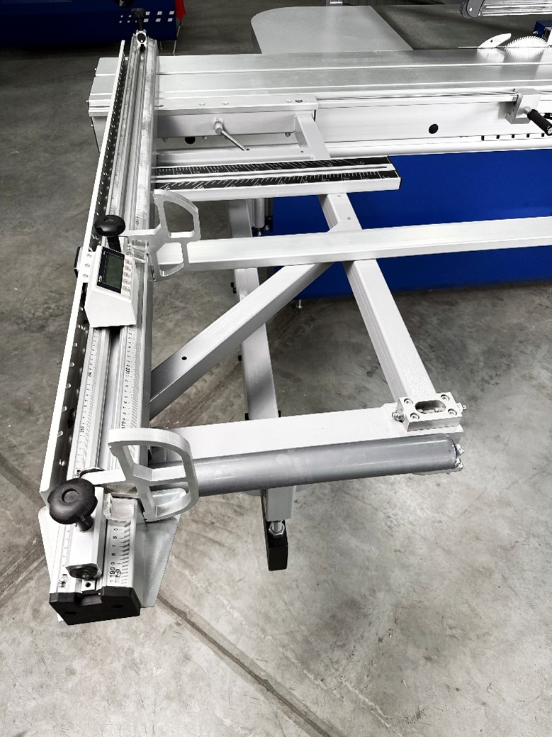 Усиленная конструкция форматного стола на каретке позволяет надежно базировать крупногабаритные детали, что дает высочайшее качество и геометрию распила. На линейке установлено два перекидных упора, один из них оснащен блоком цифровой индикации, что позволяют быстро и точно настроить станок на необходимый размер. Это исключает человеческий фактор и сводит кол-во брака к нулю. Перемещение перекидного упора осуществляется с помощью линейного подшипника на призматической направляющей, данная система крепления придает конструкции безупречную плавность хода, жесткость и как следствие отсутствие люфтов, что гарантированно обеспечивает точное позиционирование.