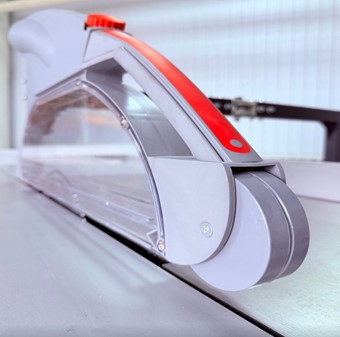 Защитный кожух пилы с роликами качения по заготовке легко регулируется по высоте, обеспечивая качественное пылеудаление, а также защиту оператора. Такая конструкция позволяет исключить из раскроя расклинивающий нож без снятия защитного кожуха. Большой европейский пылесборник, безопасный и не создающий пыли в рабочем состоянии, оснащен петлями и быстрозажимным механизмом. Если он не используется, его можно сложить или легко заблокировать. Любое положение быстрой остановки, верхний европейский пылесборник, стандартный фитинг, 2 крышки под углом 45 и 90 градусов.