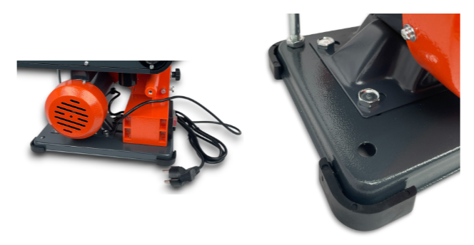 Основание станка - жесткая конструкция, обеспечивающая устойчивость станка. Асинхронный двигатель мощностью 350 Вт с медной обмоткой обеспечивает привод обоих шлифовальных узлов, а также необходимое усилие для обработки. По углам основания станка предусмотрены демпфирующие накладки. Станок подключается к сети 220 В.