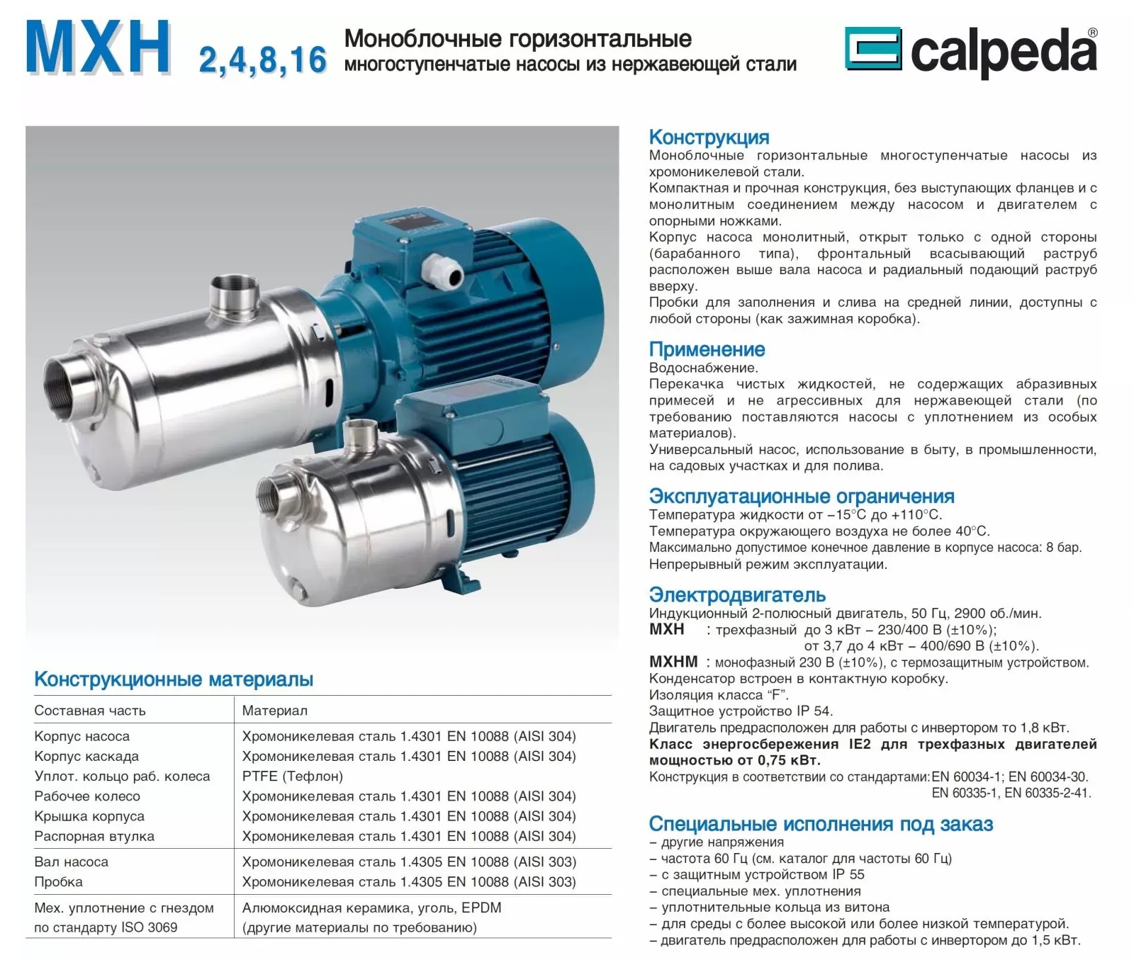 Насос Calpeda MXH относится к типу горизонтального многоступенчатого водонапорного оборудования и имеет мультифункциональную сферу использования. Позволяет обеспечивать водоснабжение коммерческих и бытовых объектов, жилых и промышленных зданий, объектов сельского хозяйства и огородных участков. Двигатель насоса имеет современное строение и обладает повышенной надежностью. Корпус насоса Calpeda MXH и основные элементы исполнены из нержавеющей стали высокого качества - это позволяет использовать оборудование при различных температурах. Для конструкции насоса характерна монолитность, также она обладает компактностью. Патрубок , работающий на всасывание, имеет горизонтельное расположение выше, чем ось вала, а патрубок напорный имеет вертикальное расположение. Защита от воды обеспечивает долговечную работу оборудования. Насос Calpeda MXH удобен в использовании и обслуживании - доступ к пробкам, которые используются для заполнения и слива, можно получить с любой стороны насоса, так как они расположены на одной линии. Мощностные потери при работе насоса исключены за счет соединения насоса, которое является монолитным. Возможны специальные исполнения насоса с трикламповым соединением Victaulic, c фланцевым соединением, со специальными уплотнениями (механическими), с кольцами (уплотнительными) из витона, с другими напряжениями и частотой, а также для условий эксплуатации при повышенных или пониженных температурах.