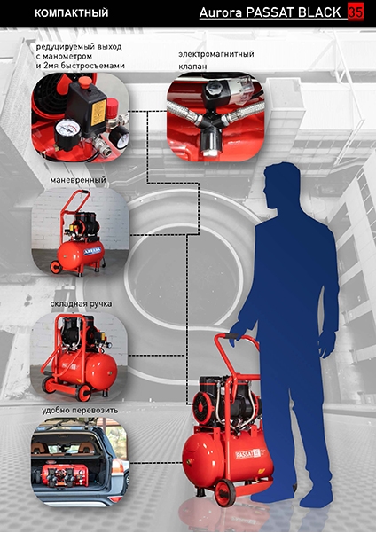 Также плюсом безмасляных компрессоров можно назвать удобство их транспортировки. В отличие от аппаратов с маслом в картере, устройства серии PASSAT BLACK можно перевозить в любом положении, что, безусловно, удобно для мобильных бригад.