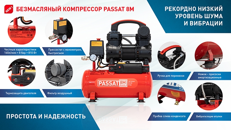 Также плюсом безмасляных компрессоров можно назвать удобство их транспортировки. В отличие от аппаратов с маслом в картере, устройства серии PASSAT BLACK можно перевозить в любом положении, что, безусловно, удобно для мобильных бригад.